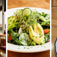 Housemade toast, mashed avocado, cabbage, carrots, radish, tarragon spirulina dressing, sprouts, and sunflower seeds